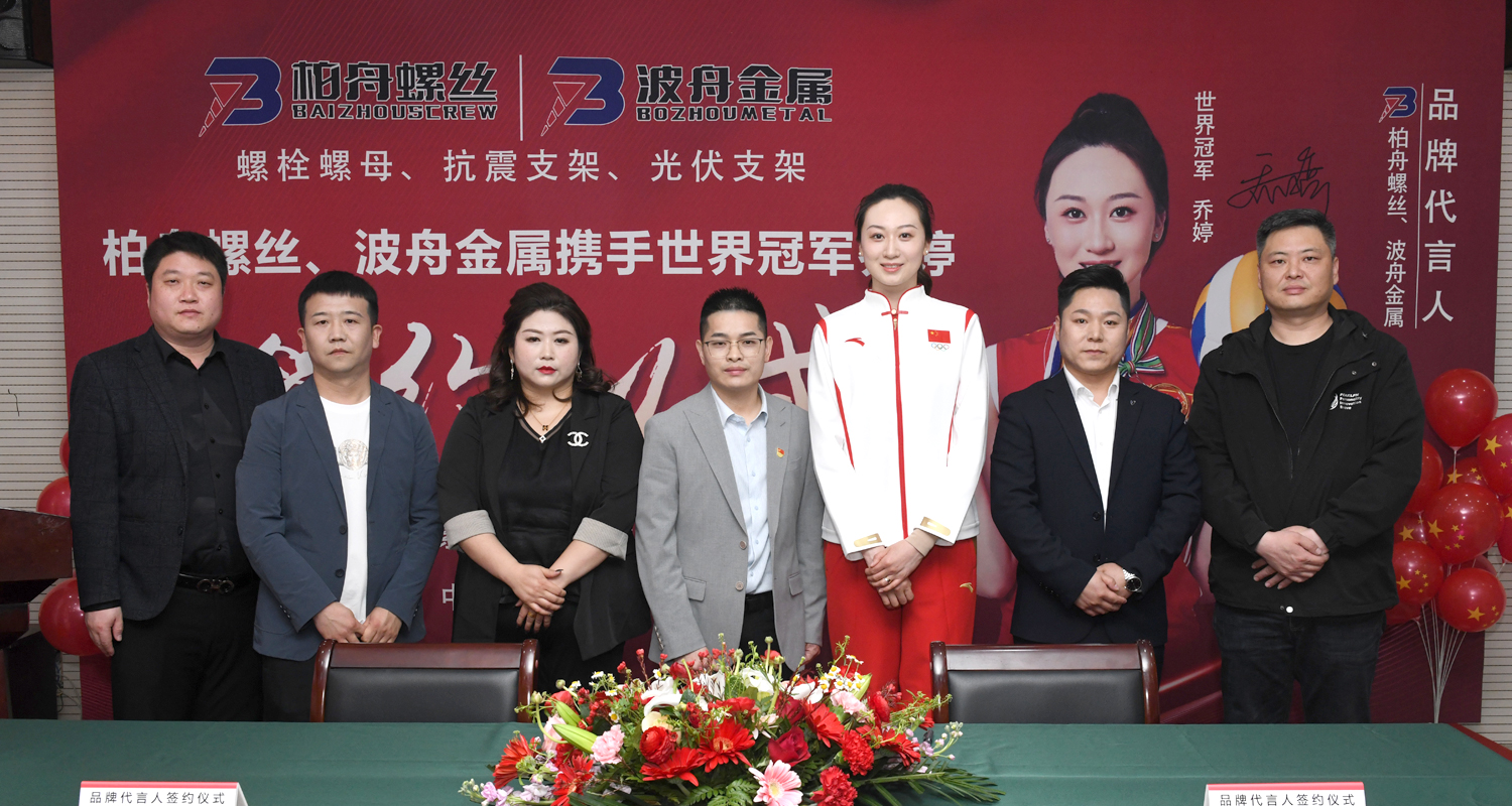河北柏舟緊固件制造有限公司攜手女排世界冠軍喬婷在石家莊一江大廈22樓柏舟公司石家莊總部舉行《品牌代言人簽約活動》。參觀過程中 總經理賈天華先生向女排世界冠軍喬婷一行介紹了柏舟公司的相關產品和業務模式。 賈天華先生、喬婷老師分別對此次簽約活動發表了講話,隨后雙方入座正式在簽約本上簽字并合影留念!柏舟公司是業內頭部品牌,也是行業內首家和世界冠軍簽約代言的企業!